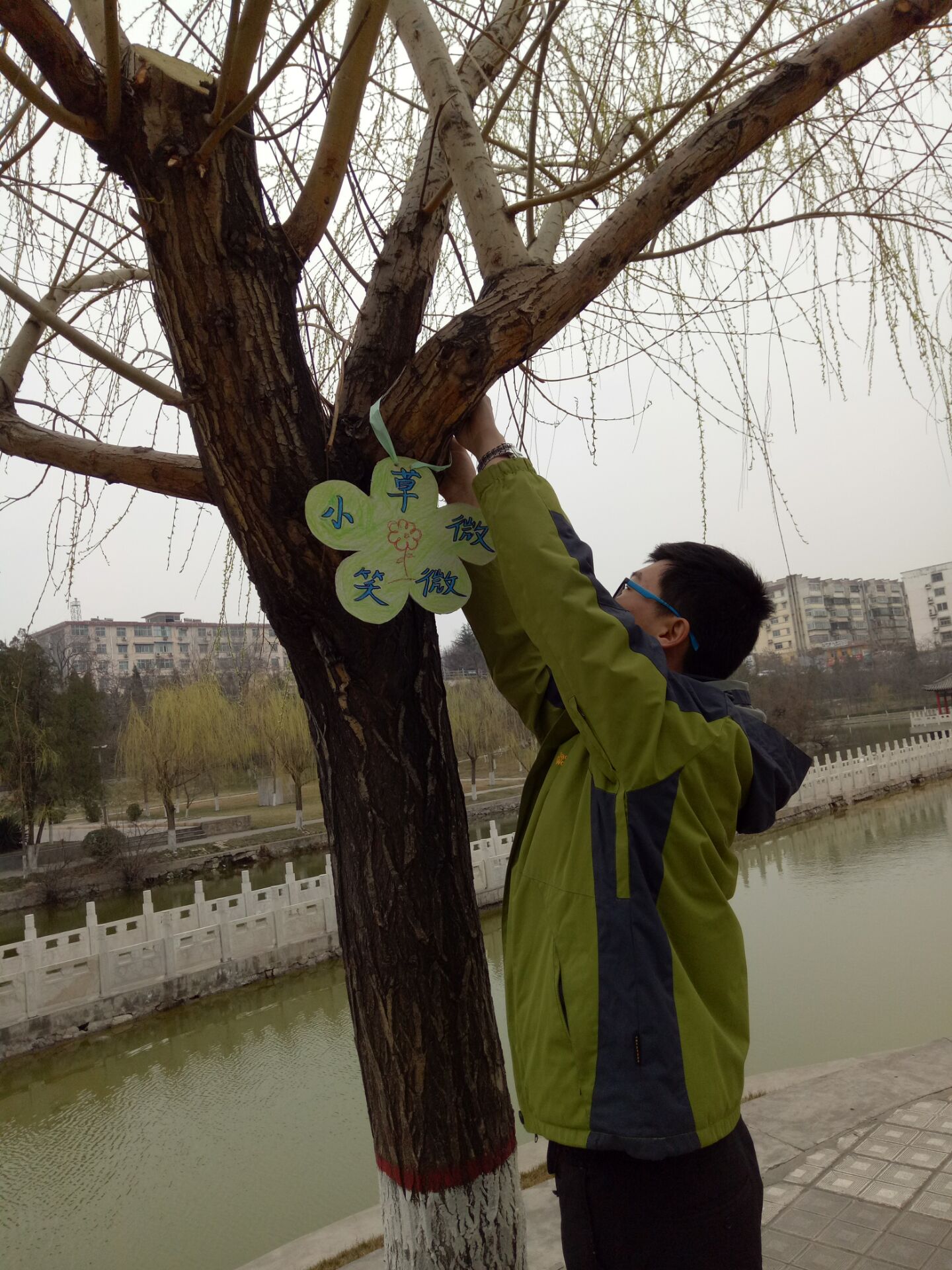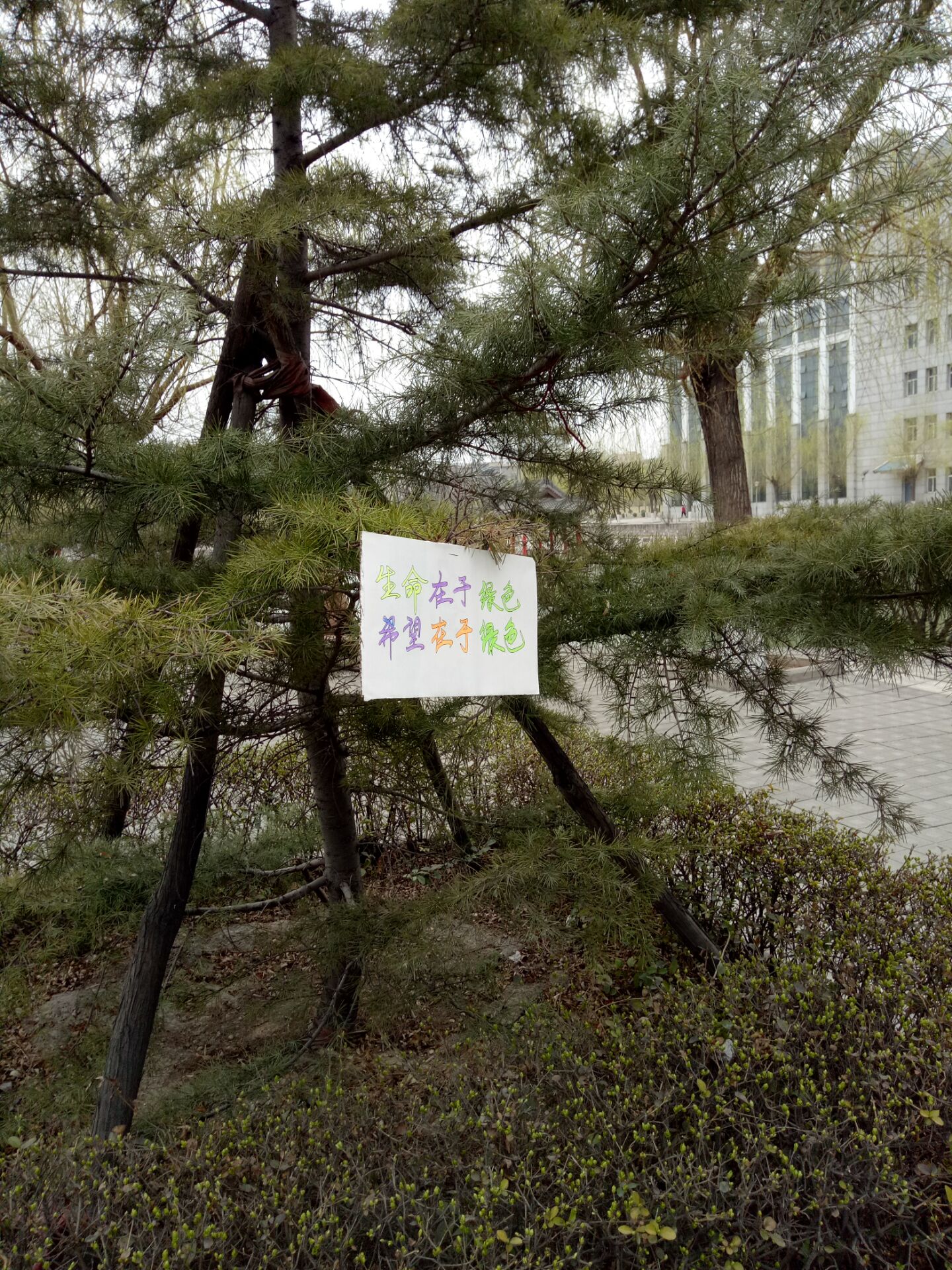 早上志愿者们早早地到达莳英园,每一个人都带来了自己精心制作的标示牌,形状各异,五彩缤纷,“枝头点点绿,谁忍手上摘”、“生命在于绿色,希望在于绿色”、“小草微微笑”等各式各样的宣传语在不断地呼吁同学、老师们多多关注身边的环境,保护我们的环境。随后,大家齐心协力,把标示牌挂上了枝头,志愿者们用自己的双手保护自己身边的绿化,从身边的绿色开始,争做绿色文明小使者,为绿化校园献出自己的一份微薄之力。