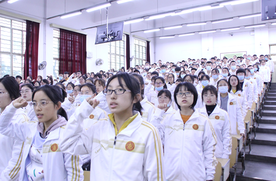 优秀团员代表带领新生团员重温入团誓词、唱团歌、戴团徽、知团情,使新生团员增强“四个意识”,坚定“四个自信”。优秀团支书代表分享开展团日活动的经验,鼓励新生班级可以组织开展“学习习近平总书记寄语精神”、“我的校园我做主”等系列主题团日活动,加强团员先进性教育和爱校荣校主题教育。