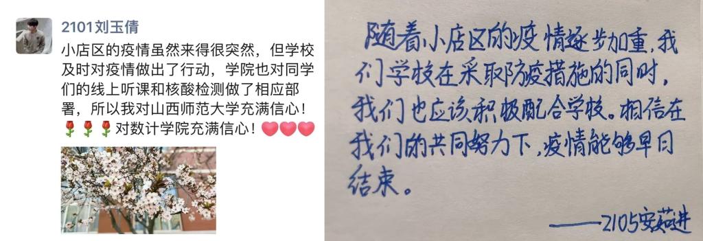 公司紧跟公司安排部署,院领导、辅导员、教师闻令而动,把关心关爱汇聚到一线,成为疫情防控的“铁军”一员,配合暖心的”大白”一起为师生安全保驾护航。团学干部、党员、青年团员发挥先锋作用,积极参与核酸检测现场的志愿服务工作,在教职工餐厅和员工餐厅维持秩序、服务师生就餐。线上线下教学有条不紊进行,行政人员从细从实落实各项工作,数计学子听从公司指挥,团结有序,共克时艰,共渡难关,彰显了作为师大人的责任与担当。在这个“倒春寒”的特殊时期,每个数计人都在用自己的行动温暖着师大。