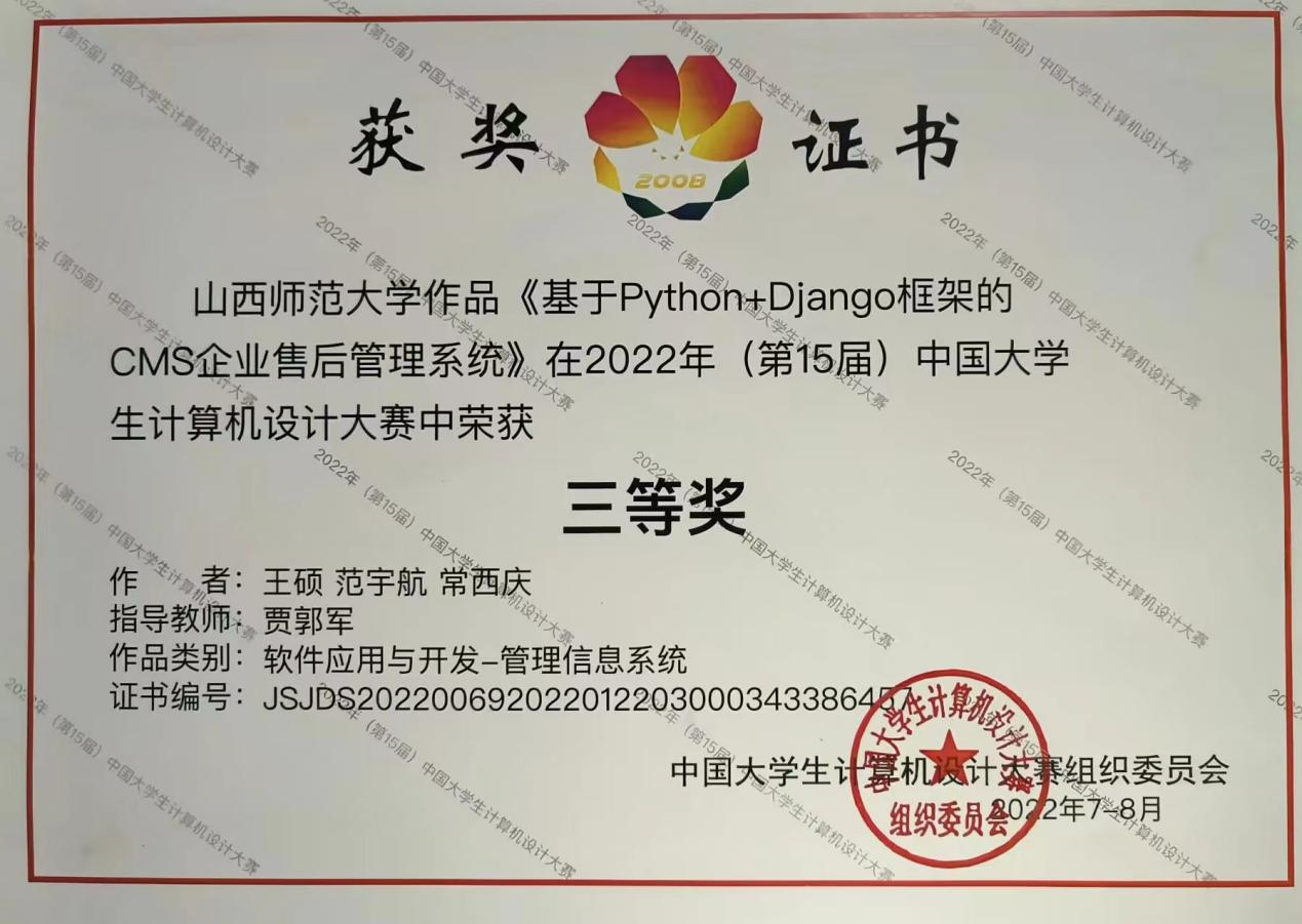 近日,在2022年(第15届)中国老员工计算机设计大赛中,必一运动参赛队伍的软件开发与应用组作品《基于Python+Django框架的CMS企业售后管理系统》荣获山西赛区二等奖、全国三等奖。
