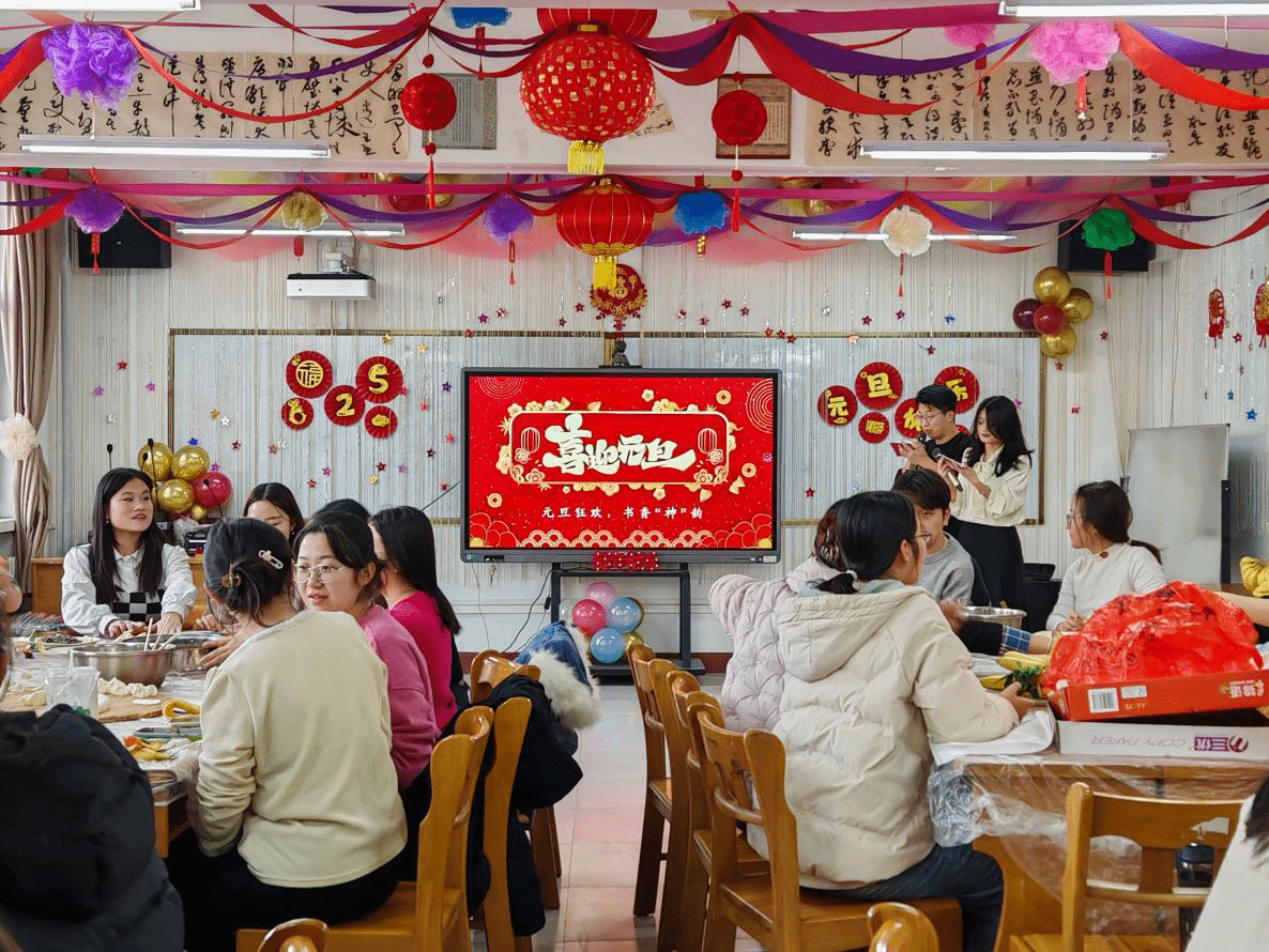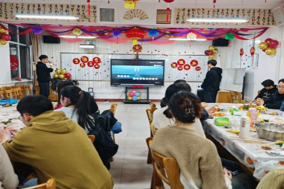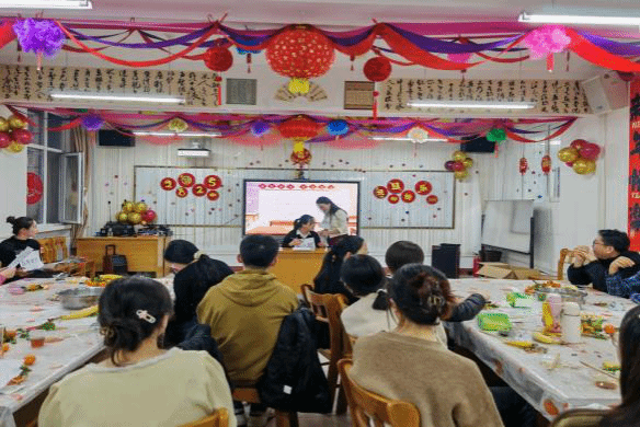 活动伊始,大家围坐在一起,纷纷投入到包饺子环节。老师与同学们一同动手,大家分工合作,和面、擀皮、包馅,忙得不亦乐乎。尽管有些饺子的形状不尽完美,但包饺子的过程充满了欢声笑语,展现了师生之间的亲密无间。在包完饺子后,大家的兴致依然高涨,不少教工提议来几局轻松的扑克牌游戏,而另一些则拉开了K歌的序幕,一时间教室里歌声与笑声交织在一起。包好的饺子被送到餐桌上,同学们和老师们一起品尝,饺子里的每一份温暖都传递着新年的祝福与期许。