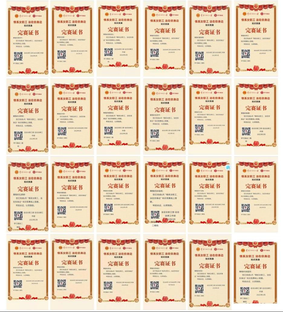 全院教职工积极响应号召,25名教职工获得“情系女职工,法在你身边”知识竞赛证书。此次竞赛活动的成功开展,增强了公司女职工的法律意识和维权能力,使女职工进一步明确了关乎切身的合法权益,强化了学法、懂法、用法意识;同时调动和鼓励了女职工的积极性,营造了关心爱护女职工的良好氛围。