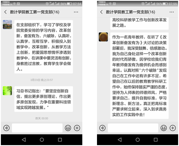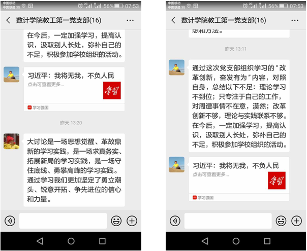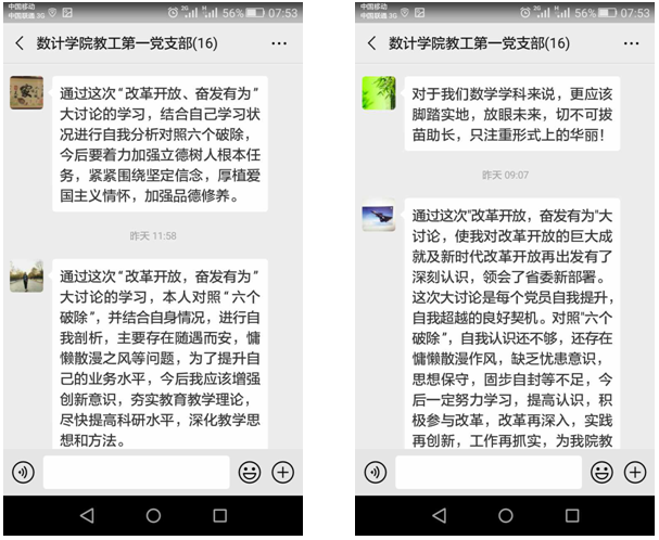 按照公司的安排,结合支部实际,我支部进行了“改革创新、奋发有为”大讨论线上交流活动,支部党员纷纷在支部群里讨论留言,交流学习心得。